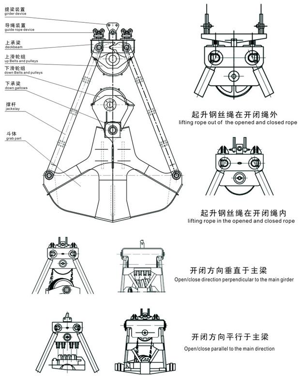 في جميع أنواع الرافعات مع مجموعتين من المحركات (محرك الرفع) ، كل محرك من نوع durm يقودان حبلين سلكيين ، يقومان بتجميع حبال سلكية واحدة متجذرة في إطار التوازن للدعم ، وتمر مجموعة أخرى من الحبال السلكية ببكرة الحزم العلوية. بكرة شعاع أسفل ، مركب كتلة بكرة كما دلو الاستيلاء مفتوحة وثيق.